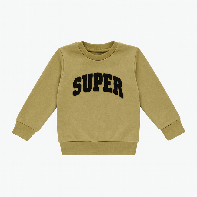 Keep your little one warm and stylish with this kids beige sweatshirt featuring bold "SUPER" chenille embroidery on the chest. Crafted from soft cotton fleece, it offers both comfort and durability for everyday wear.