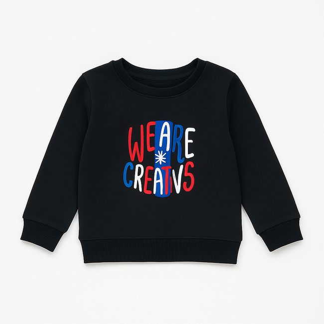 Add fun and creativity to your child’s wardrobe with this stylish kids’ black sweatshirt. Featuring bold “We Are Creative” embroidery in vibrant red, blue, and white, this sweatshirt is perfect for casual outings, school, or playtime. Made with soft and breathable fabric, it ensures warmth and comfort while keeping your little one trendy.