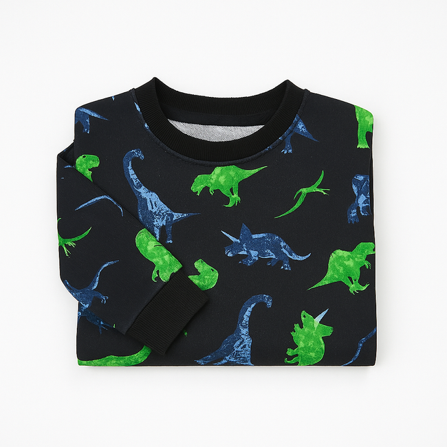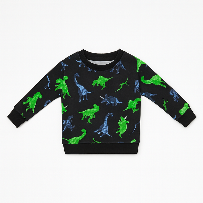 Bring fun and comfort together with this kids’ dinosaur print sweatshirt. Designed with a playful all-over pattern featuring green and blue dinosaurs on a classic black base, this sweatshirt is perfect for little dino-lovers. Made with soft, breathable fabric, it ensures all-day comfort while keeping your child warm and stylish.