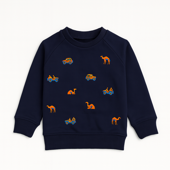 Make playtime stylish with this unique kids’ navy blue sweatshirt, decorated with colorful embroidered camels and jeeps for a fun desert adventure vibe. Perfect for kids who love comfort with a touch of playful design.