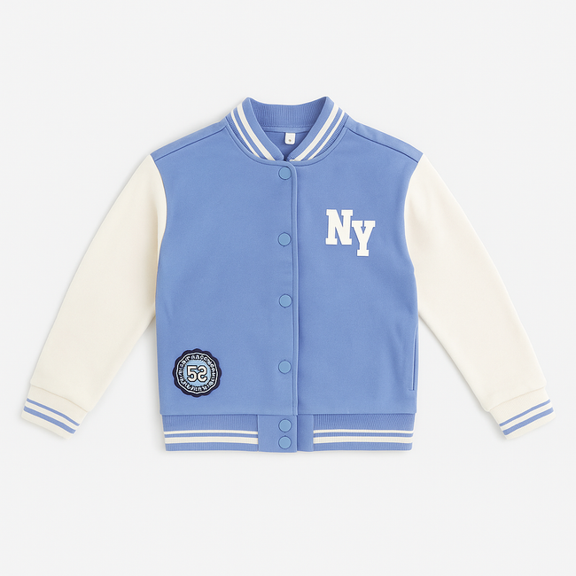 Bring cool sporty vibes to your kid’s wardrobe with our Kids Down Shoulder NY Baseball Varsity Jacket. Designed with a relaxed down-shoulder fit, this jacket offers a trendy oversized look that’s both stylish and comfortable. The blue and white color combination with NY embroidery gives it a classic baseball feel — perfect for school days, outings, or casual wear.