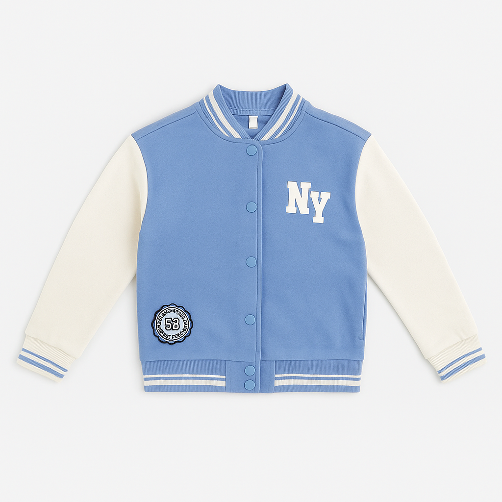 Bring cool sporty vibes to your kid’s wardrobe with our Kids Down Shoulder NY Baseball Varsity Jacket. Designed with a relaxed down-shoulder fit, this jacket offers a trendy oversized look that’s both stylish and comfortable. The blue and white color combination with NY embroidery gives it a classic baseball feel — perfect for school days, outings, or casual wear.
