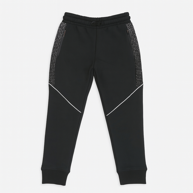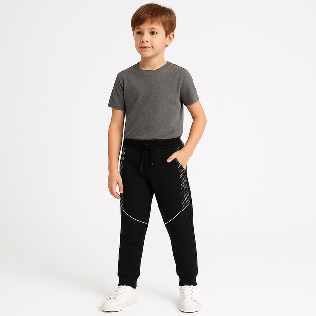 Upgrade your little one’s wardrobe with these boys’ black jogger pants featuring a modern sporty look. Designed with dotted side panels and sleek white piping across the legs, these joggers combine comfort with style for everyday wear.