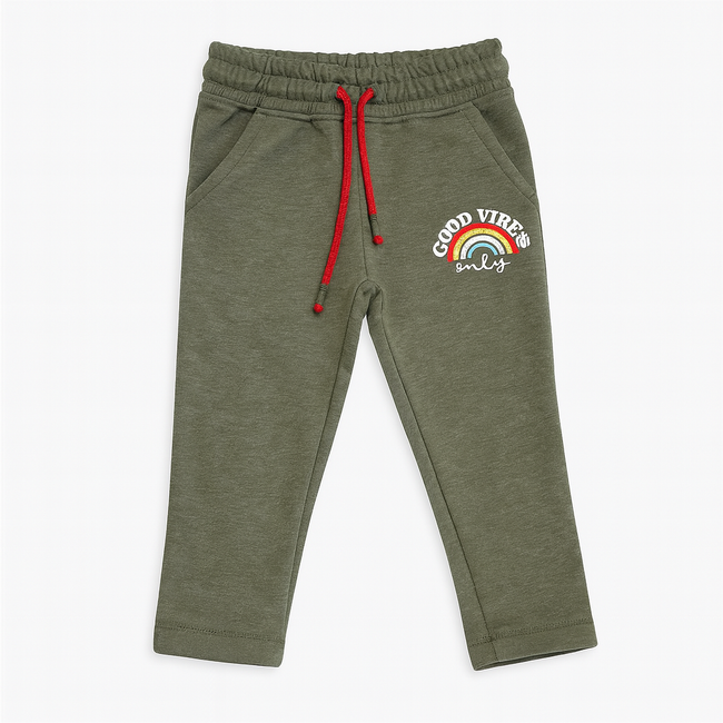 Bring positivity and comfort to your child’s wardrobe with these Good Vibes Only jogger pants. Designed in a stylish olive green shade, these joggers feature a cheerful rainbow graphic with the words “Good Vibes Only”, making them both playful and trendy.
