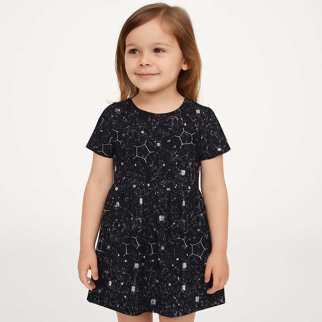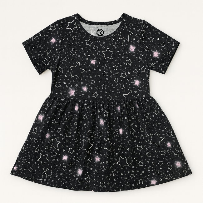 A charming knee-length frock designed for little girls, made from soft, breathable cotton fabric. It features a round neckline, short puff sleeves, and a fitted bodice that flows into a flared skirt for a playful, twirl-worthy look. Delicate lace trimming along the hem and sleeves adds a touch of elegance, while a matching satin bow at the waist provides a sweet finishing touch. Ideal for birthday parties, festive occasions, or casual summer outings.