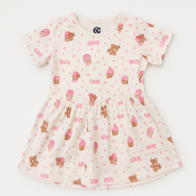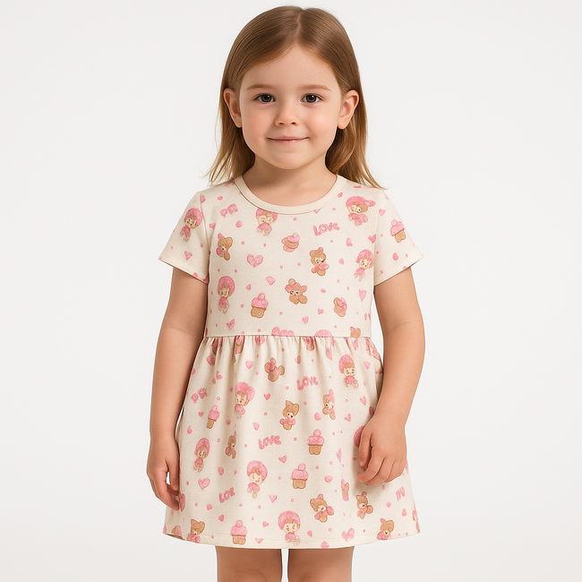 A charming knee-length frock designed for little girls, made from soft, breathable cotton fabric. It features a round neckline, short puff sleeves, and a fitted bodice that flows into a flared skirt for a playful, twirl-worthy look. Delicate lace trimming along the hem and sleeves adds a touch of elegance, while a matching satin bow at the waist provides a sweet finishing touch. Ideal for birthday parties, festive occasions, or casual summer outings.