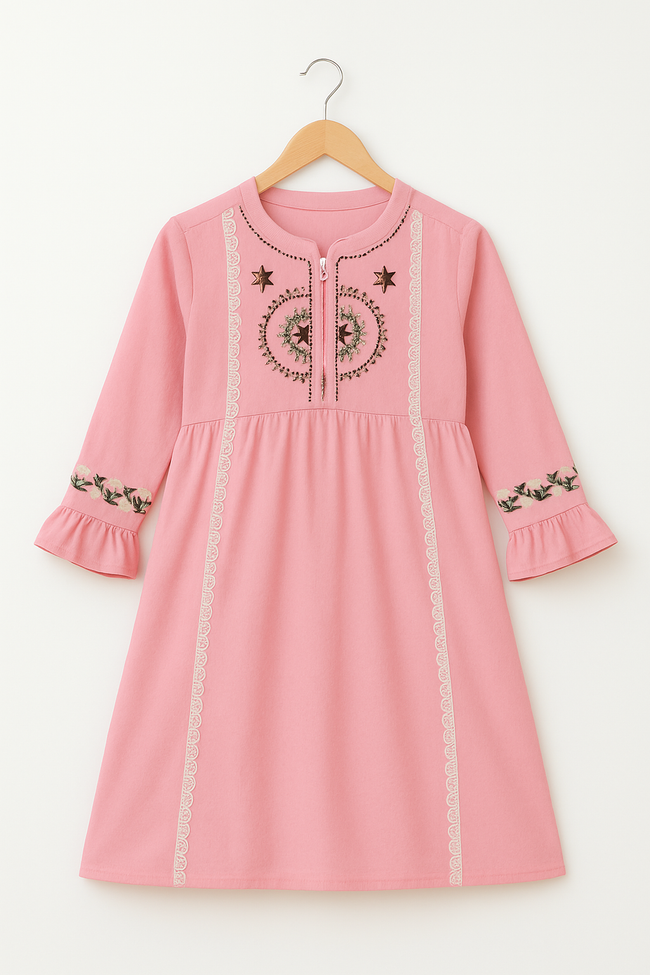 A stylish and comfortable girls’ kurti designed for both casual and festive wear. Crafted from soft, breathable fabric for all-day comfort, it features a flattering straight cut with elegant embroidery/printed patterns (customizable based on style). The round or V-neckline, three-quarter or full sleeves, and side slits add to its charm, making it perfect to pair with leggings, jeans, or palazzos. Ideal for school events, family gatherings, or daily wear.