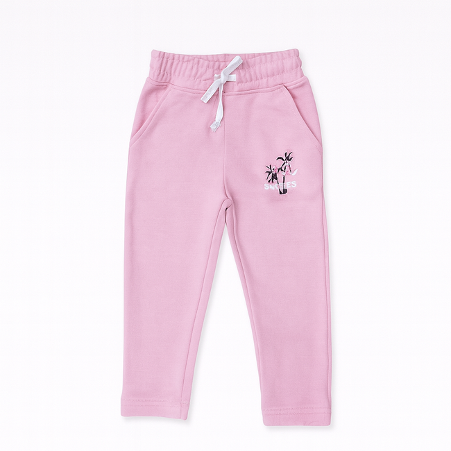eep your little one comfy and stylish with these girls’ pink Trouser, perfect for everyday wear. Designed with a soft cotton blend and a fun palm tree graphic with “SMILES” text detail, these joggers bring both comfort and charm to casual outfits.