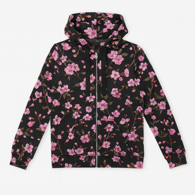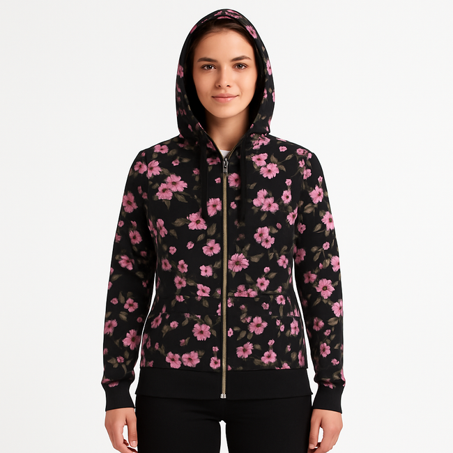 Women’s Black Floral Zip-Up Hoodie – Cotton Fleece