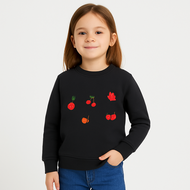 Add a fun twist to your child’s winter wardrobe with this cozy black sweatshirt featuring vibrant embroidered fruit and floral designs. Crafted from soft, breathable fabric, it ensures all-day comfort while keeping your little one warm. The ribbed cuffs and hem provide a snug fit, making it perfect for casual outings, playdates, or everyday wear. Pair it with jeans or joggers for a stylish and modern look.