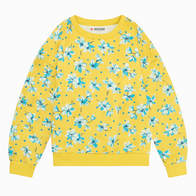 Brighten up your wardrobe with this stylish yellow floral print sweatshirt. Made from soft, breathable cotton, it offers all-day comfort and a relaxed fit. Featuring a vibrant blue and white floral pattern with ribbed cuffs and hem, this sweatshirt is perfect for casual outings, loungewear, or layering in cooler weather. A must-have for a fresh and trendy look!
