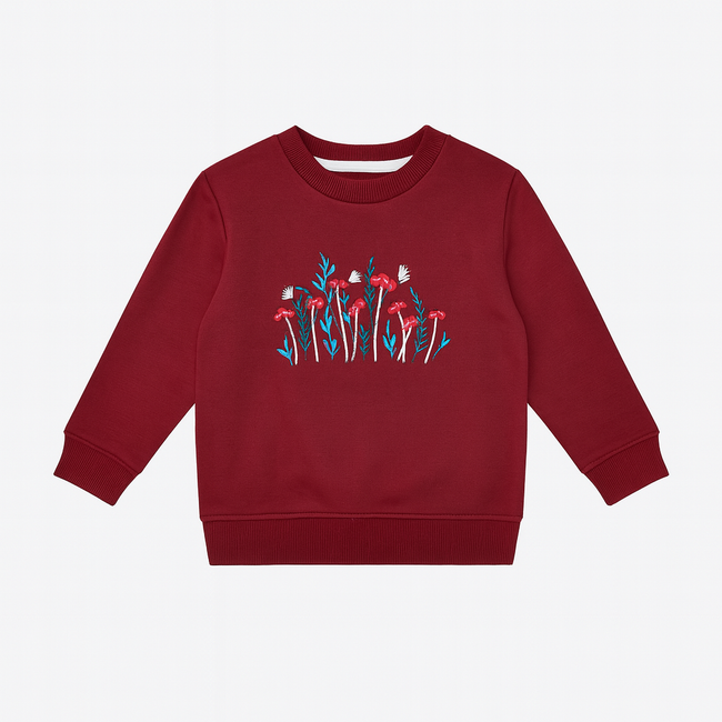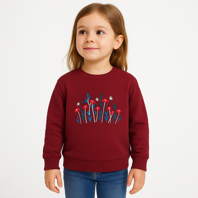 Add charm and comfort to her everyday style with this maroon sweatshirt, beautifully detailed with floral embroidery. Crafted from soft, breathable fabric, it’s perfect for keeping your little one cozy while looking stylish. Designed with ribbed cuffs, hem, and neckline for a snug fit, this sweatshirt pairs easily with jeans, leggings, or skirts. A must-have for casual wear and outings.