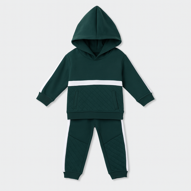 Keep your little one stylish and cozy with this two-piece boys’ tracksuit. Featuring a soft quilted hoodie with a front kangaroo pocket and matching jogger pants, this set is perfect for everyday wear, playtime, or outings. Designed in a modern dark green color with white side stripes, it offers comfort, durability, and a trendy look. Ideal for autumn and winter seasons.