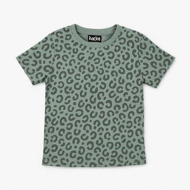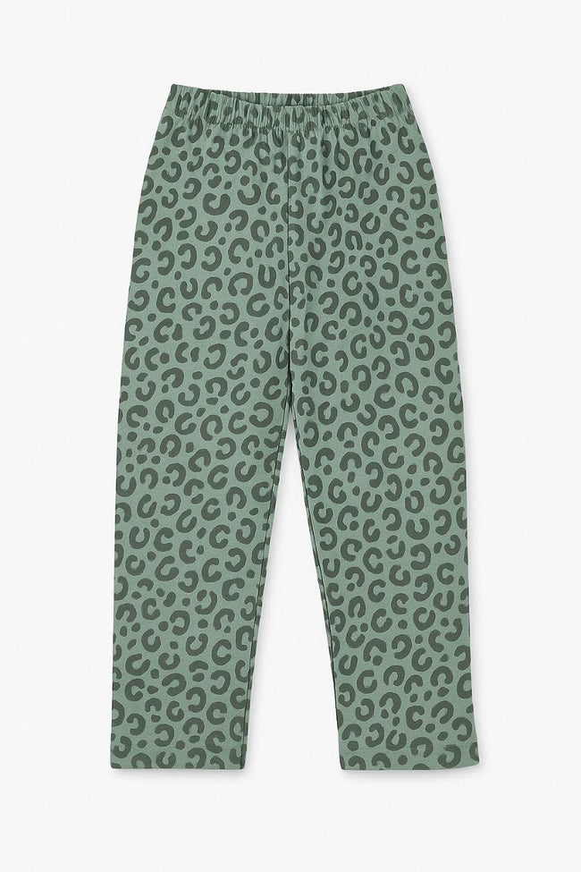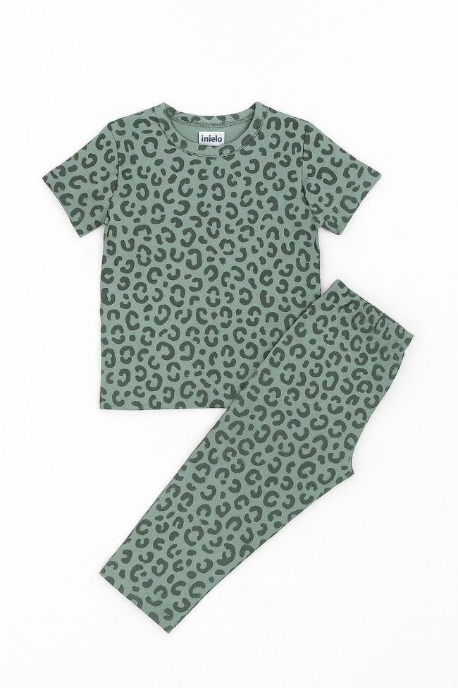 Add a fierce twist to bedtime with this soft and stylish pajama set for kids. Made in a muted sage green color and covered in a trendy all-over leopard print, this set includes a short-sleeve crew neck T-shirt and full-length stretch pants. Designed for both comfort and style, it’s perfect for relaxed evenings, sleepovers, or casual daywear.